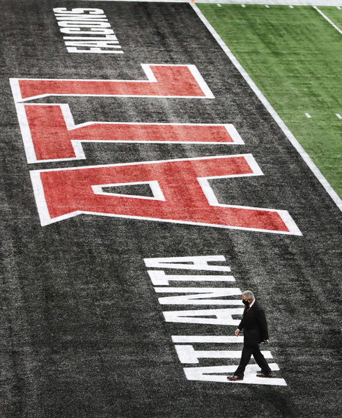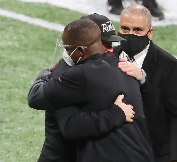 Atlanta Falcons head coach Raheem Morris and Las Vegas Raiders head coach Jon Gruden greet each other with a hug after the Falcons beat the Raiders 43-6 on Sunday, Nov. 29, 2020, in Atlanta, Georgia. (Curtis Compton/Atlanta Journal-Constitution/TNS)Atlanta Falcons owner Arthur Blank walks off the field as his team prepares to play the Las Vegas Raiders on Sunday, Nov. 29, 2020, in Atlanta, Georgia. (Curtis Compton/Atlanta Journal-Constitution/TNS)Atlanta Falcons quarterback Matt Ryan throws a touchdown pass to wide receiver Calvin Ridley and is leveled by Las Vegas Raiders defensive tackle Johnathan Hankins, taking the hit for the score to take a 13-3 lead during the second quarter on Sunday, Nov. 29, 2020, in Atlanta, Georgia. (Curtis Compton/Atlanta Journal-Constitution/TNS)Las Vegas Raiders center Rodney Hudson lingers on the bench after a 43-6 loss to the Atlanta Falcons on Sunday, Nov. 29, 2020, in Atlanta, Georgia. (Curtis Compton/Atlanta Journal-Constitution/TNS)Atlanta Falcons quarterback Matt Ryan throws a pass with backup Matt Schaub looking on while preparing to play the Las Vegas Raiders on Sunday, Nov. 29, 2020, in Atlanta, Georgia. (Curtis Compton/Atlanta Journal-Constitution/TNS)Las Vegas Raiders quarterback Derek Carr throws an interception under pressure from Atlanta Falcons linebacker Mykal Walker that Falcons linebacker Deion Jones returned for a touchdown during the third quarter on Sunday, Nov. 29, 2020, in Atlanta, Georgia. (Curtis Compton/Atlanta Journal-Constitution/TNS)The Las Vegas Raiders' bench looks on as Atlanta Falcons linebacker Deion Jones intercepts a Derek Carr pass and returns it for a touchdown for a 23-3 lead during the third quarter on Sunday, Nov. 29, 2020, in Atlanta, Georgia. The Falcons beat the Raiders 43-6. (Curtis Compton/Atlanta Journal-Constitution/TNS)Atlanta Falcons wide receiver Brandon Powell catches a touchdown pass in the end zone past Las Vegas Raiders cornerback Nevin Lawson for a 30-6 lead with Falcons wide receiver Christian Blake (left) beginning the celebration during the third quarter on Sunday, Nov. 29, 2020, in Atlanta, Georgia. (Curtis Compton/Atlanta Journal-Constitution/TNS)Atlanta Falcons linebacker LaRoy Reynolds celebrates a 43-6 victory over the Las Vegas Raiders during the fourth quarter on Sunday, Nov. 29, 2020, in Atlanta, Georgia. (Curtis Compton/Atlanta Journal-Constitution/TNS)