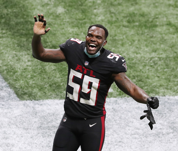 Atlanta Falcons linebacker Foyesade Oluokun sends Las Vegas Raiders running back Devontae Booker flying with a tackle during the third quarter on Sunday, Nov. 29, 2020, in Atlanta, Georgia. The Falcons beat the Raiders 43-6. (Curtis Compton/Atlanta Journal-Constitution/TNS)