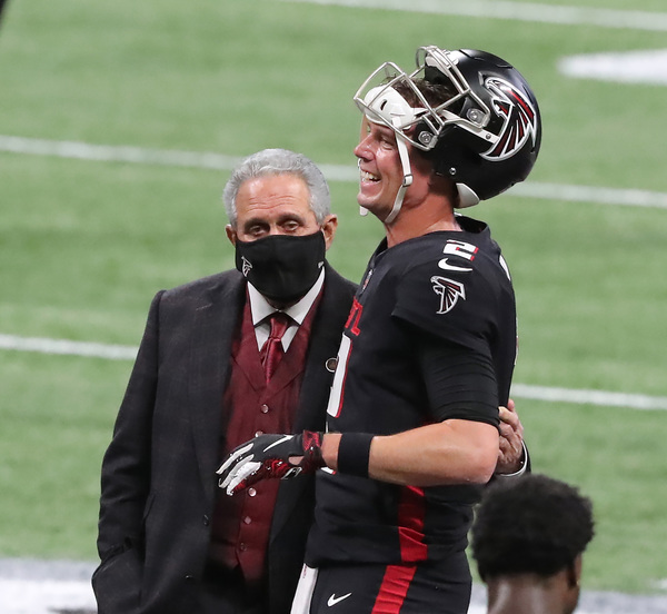 Atlanta Falcons owner Arthur Blank and quarterback Matt Ryan share a laugh as the team prepares to play the Las Vegas Raiders on Sunday, Nov. 29, 2020, in Atlanta, Georgia. (Curtis Compton/Atlanta Journal-Constitution/TNS)