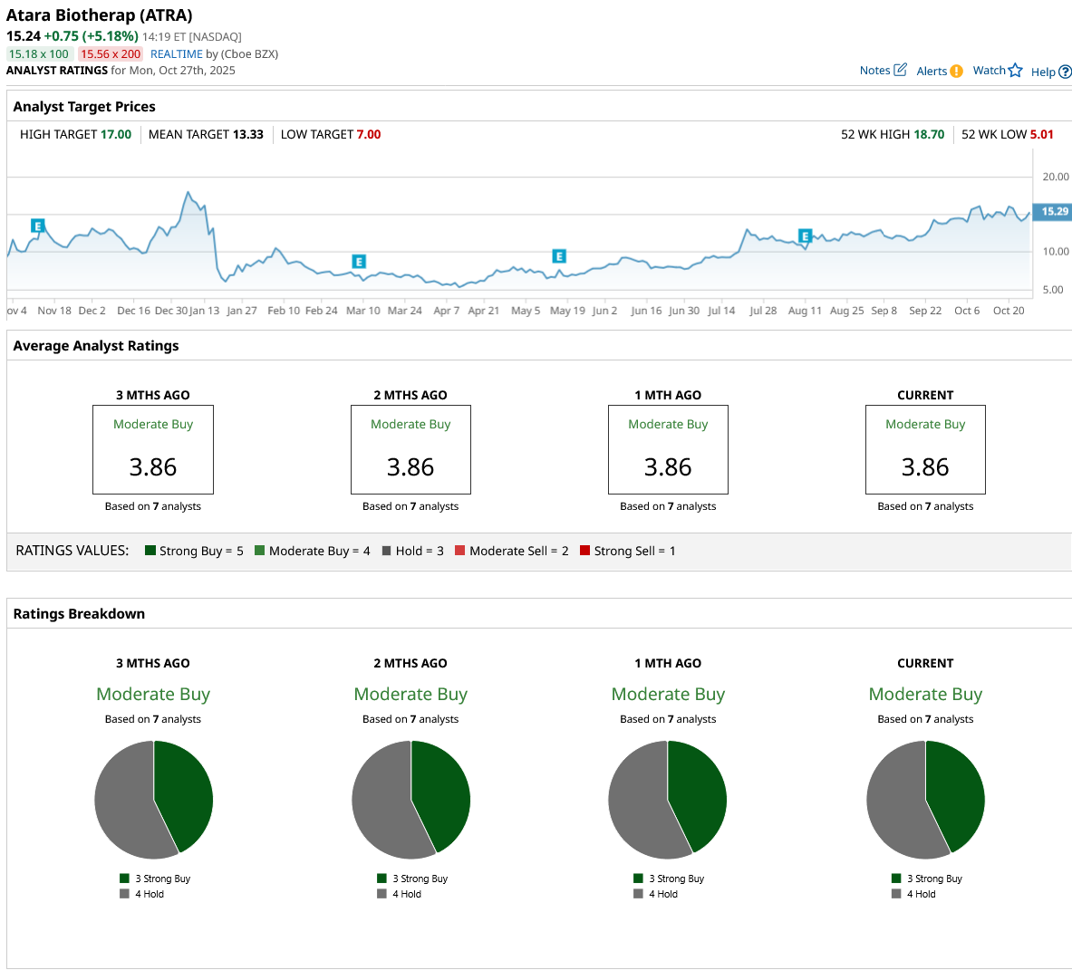 Overall, the consensus for ATRA stock is a “Moderate Buy.” Out of the seven analysts in coverage, three rate it a “Strong Buy,” and four recommend it as a “Hold.” The stock has already surpassed its mean target price of $13.33. However, its high price estimate of $30 indicates the stock could still gain as much as 96% in the next 12 months.