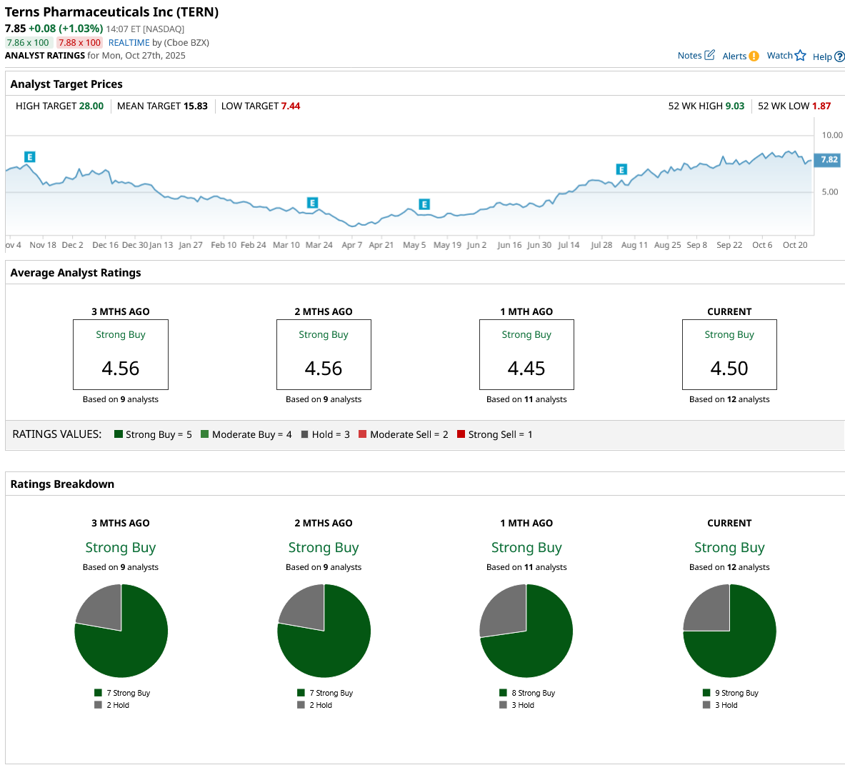 Overall, the consensus for TERN stock is a “Strong Buy.” Out of the 12 analysts in coverage, nine rate it a “Strong Buy,” while three recommend a “Hold.” Based on the mean target price of $15.83, the stock has a potential upside of 101% from current levels. Plus, its high price estimate of $28 indicates the stock could gain as much as 257% in the next 12 months.