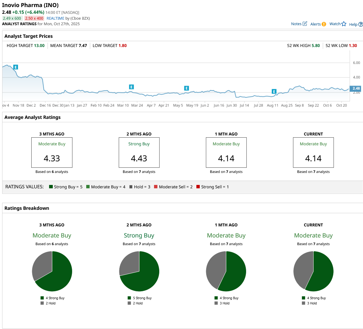 Overall, the consensus for INO stock is a “Moderate Buy.” Out of the seven analysts in coverage, four rate it a “Strong Buy,” and three recommend a “Hold.” Based on the mean target price of $7.47, the stock has a potential upside of 200% from current levels. Plus, its high price estimate of $13 indicates the stock could gain as much as 425% in the next 12 months.