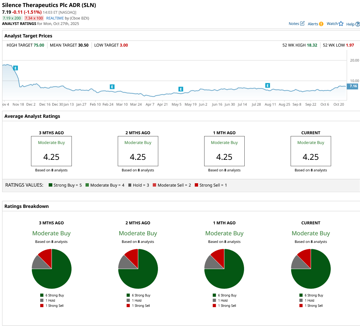 Overall, the consensus for Silence stock is a “Moderate Buy.” Out of the eight analysts in coverage, six rate it a “Strong Buy,” one recommends it as a “Hold,” and one says it is a “Strong Sell.” Based on the mean target price of $30.50, the stock has a potential upside of 324% from current levels. Plus, its high price estimate of $75 indicates the stock could gain as much as 943% in the next 12 months.