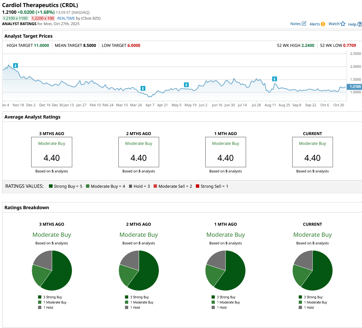 Overall, the consensus for CRDL stock is a “Moderate Buy.” Out of the five analysts in coverage, three rate it a “Strong Buy,” one recommends a “Moderate Buy,” and one says it is a “Hold.” Based on the mean target price of $8.50, the stock has a potential upside of 602% from current levels. Plus, its high price estimate of $11 indicates the stock could gain as much as 809% in the next 12 months.