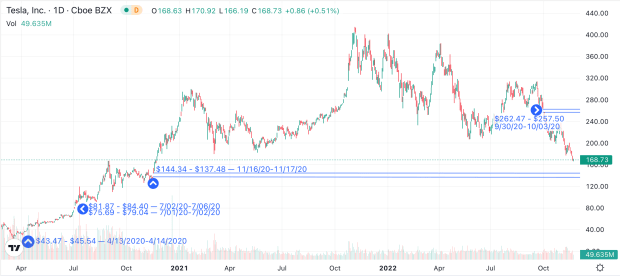 In this case, (TSLA) has four large gaps all the way down to $43.47 — and one ($144.34 - $137.48) that is now within striking distance (roughly 15% away at the time of writing). At the same time, there is one unfilled gap above ($257.50 - $262.47), which is more than 50% away from Tesla's current share price.