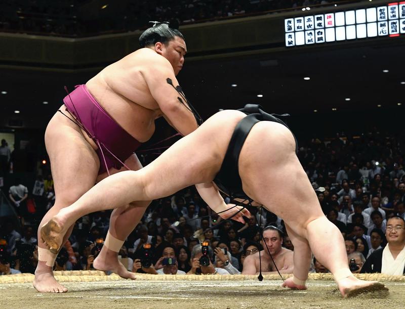 Takakeisho (11-3) pushed No. 5 maegashira Ryuden (6-8) out of the ring to keep himself in the running. Fellow sekiwake Mitakeumi (11-3) thrusted down ozeki Goeido (9-5). Both sekiwake are aiming for their second title in the highest makuuchi division.