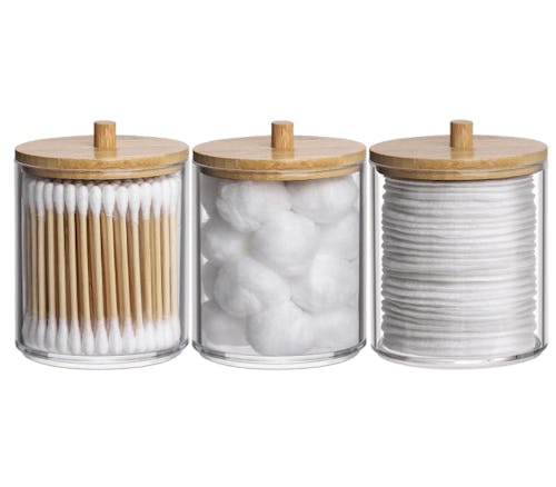 These apothecary jars are an expensive-looking way to organize bathroom supplies, but their sneaky plastic design is super durable at the same time. Not only are they durable enough for your bathroom counter, but each one has adorable wooden lids to finish off these chic little jars and add an expensive-looking touch.