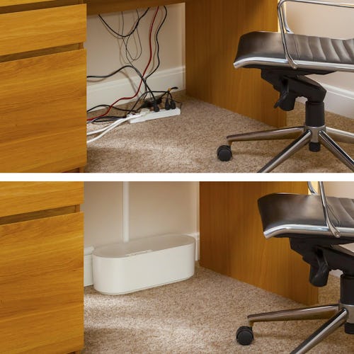 It doesn’t matter where you have a clump of messy cords and chargers around your home because this minimalist cable management box will look nice anywhere. The ventilated design is small enough to fit on a countertop or tuck behind furniture, but it can still fit a standard power strip. Meanwhile, the three slots at the back will keep the cords tidy but still accessible.