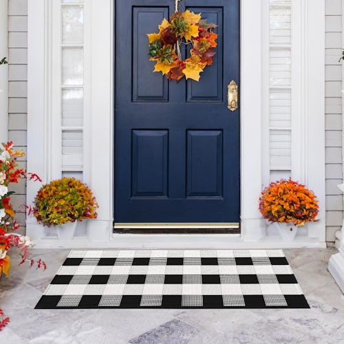 A sophisticated plaid outdoor rug that is easy to keep mud-free