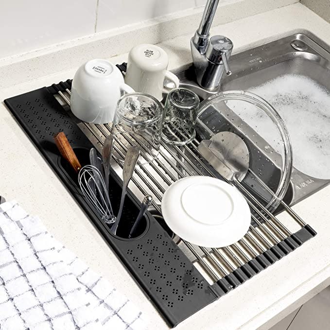 The clever engineering of this stainless steel and rubber dish-drying rack reduces what once took up half of the counter into an easy-to-store roll that sits on a portion of your sink. The stainless steel rods are strong and heat resistant. The cup for utensils pops out and can be used as a small colander. And, it all rolls up and tucks in a drawer when not in use.