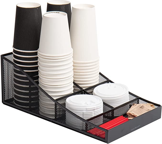 Keep all your coffee pods, tea bags, hot chocolate, and fixings tidily out on the counter in this black mesh condiment organizer. It makes preparing a quick cup of a sustaining warm beverage easy and convenient, while getting all that clutter out of the cupboards where it was hard to find. With a variety of compartments to fit different-sized items, it keeps everything in one place and within reach.