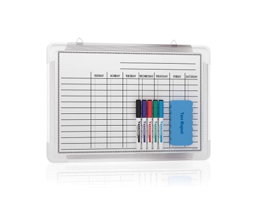 Whose turn was it to unload the dishwasher? This daily chore chart makes it easy to keep track of who was supposed to do what, while the hooks on the top let you hang it practically anywhere. Each order comes with five white erase markers.