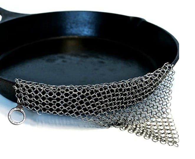 The trick to cleaning cast iron is to remove leftover food without using any soap — and this scrubber can help. The stainless steel ringlets chip away at burnt-on bits without affecting the seasoning, and there's even a hanging loop at the corner for easy storage.