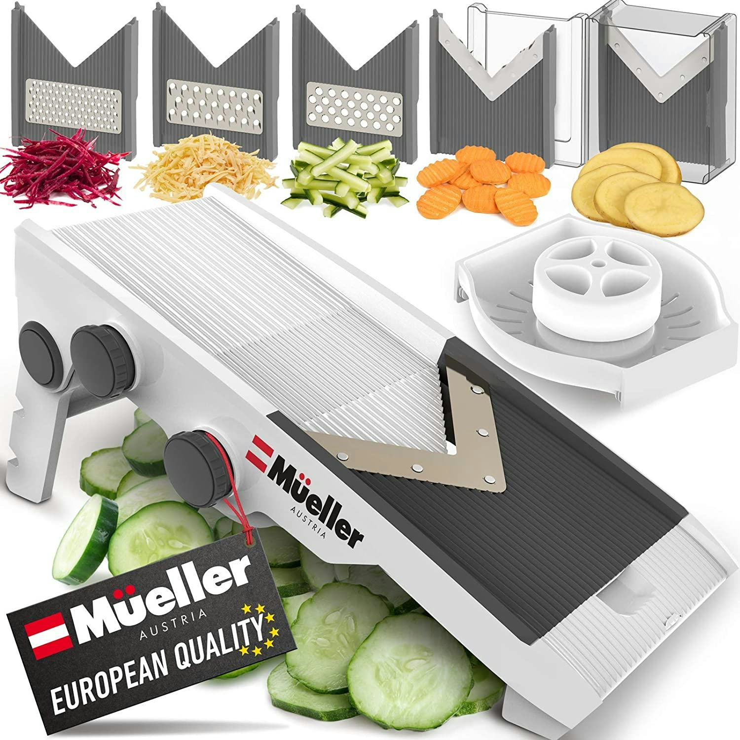 Save yourself some time in the kitchen by using this mandoline the next time you need to slice, grate, or shred some ingredients. The five interchangeable blades are made from sharp stainless steel, while the knob on the side lets you adjust how thick your slices come out.