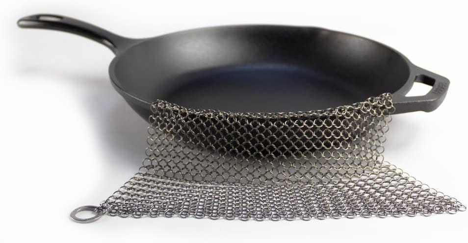 Made rom premium-grade stainless steel that'll never rust, this chainmail scrubber is a must-have for anyone with cast iron cookware. Not only will it preserve the built-up seasoning, but it effortlessly chips away at any little bits of crud that've gotten stuck to your pan.