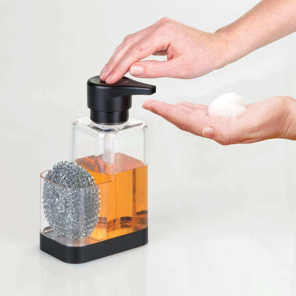 With space for soap and a scrubber, this dispenser is a must-have for any crowded sink. The soap reservoir is large enough for almost an entire bottle of soap, while the side compartment can fit a scrubber, brush, or even sink stopper.
