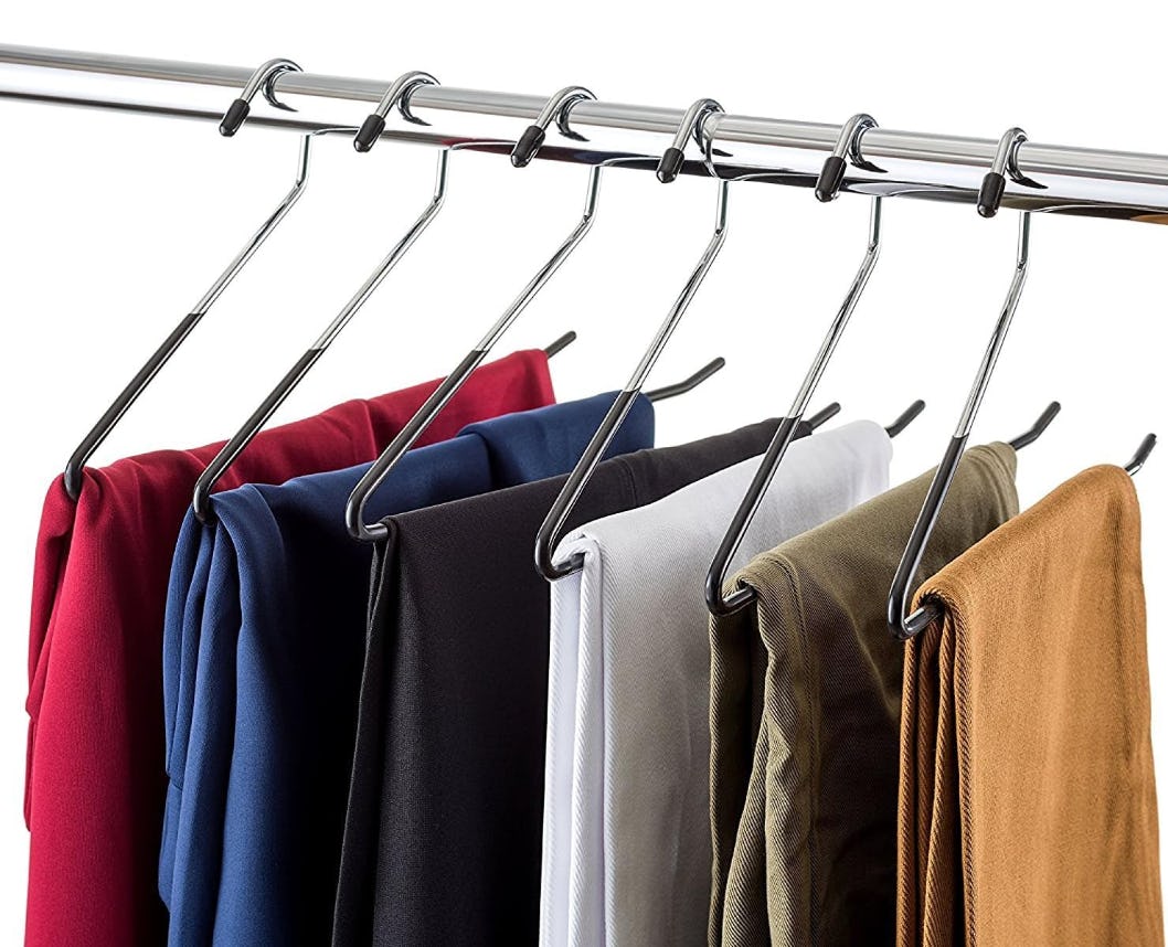 If you want to keep pants in the closet with all your other clothes, hanging them on a hanger can be irritating. These trouser hangers make it easy. They are open at one end so you can slide the fold of the pants over them. Your trousers will be wrinkle-free and easy to find. “They make my pants take up less space, stay on the hangers well, and make the closet look much neater and more organized!” said one reviewer.