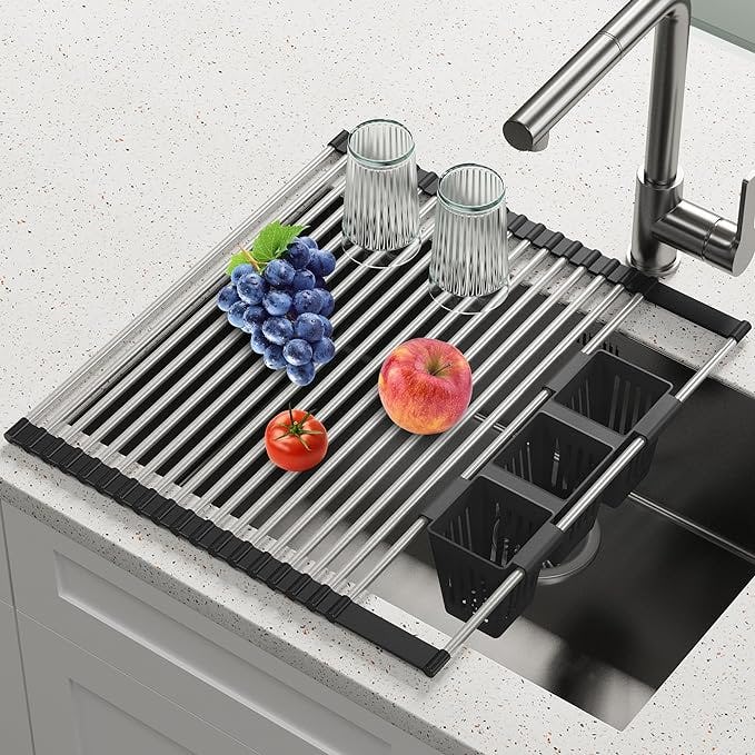 Keep this roll-up dish drying rack tucked in a drawer and unroll it over the sink when you want to rinse some fruits or vegetables, drip dry a few dishes, or set a pan down to fill it from the tap. It has snap-in utensil holders, is sturdy enough to hold a pan full of water, and comes in several size and color options.