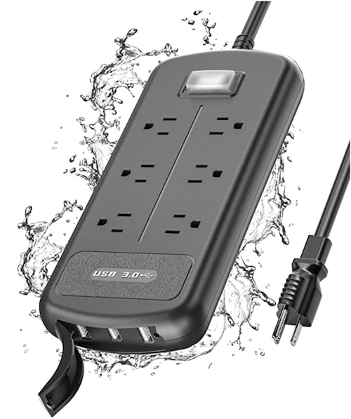 This power strip is completely weatherproof so you can safely use it outside to plug in your devices and appliances, and three USB ports leave plenty of room for tech. The outlets are widely spaced to prevent bulky plugs from blocking other outlets, and it provides surge protection. Each strip comes with a built-in wall mount and 6-foot extension cord.