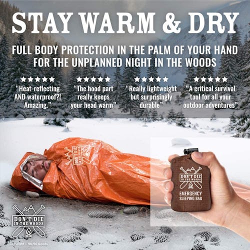 Always be prepared for camping on a cold night with this emergency sleeping bag with a built-in hood. The mylar lining reflects your body heat to retain warmth and prevent hypothermia. Plus, this waterproof and windproof sleeping bag is lightweight and folds into a compact drawstring bag.