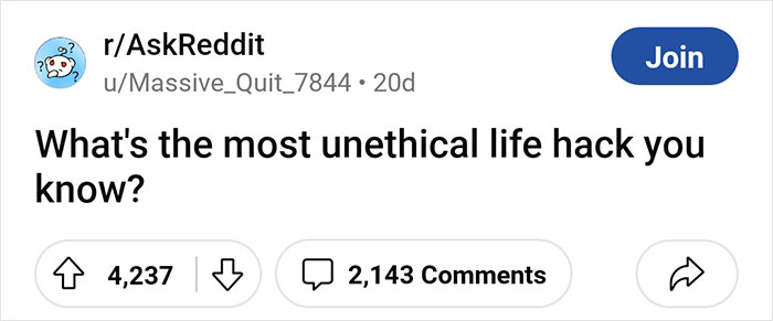 However, Reddit user Massive_Quit_7844 was interested in the opposite — our egotistical side. So they made a post on the platform, asking "What's the most unethical life hack you know?"