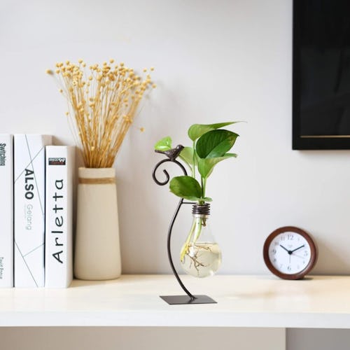 This glass planter is all about minimalist charm. Its clear glass bulb sits upside down in a holder while showing off roots and water levels. Perfect for a single cutting or a small plant, it comes with a modern stand that doubles as a display piece. The planter is available in four designs, including a cute little heart.