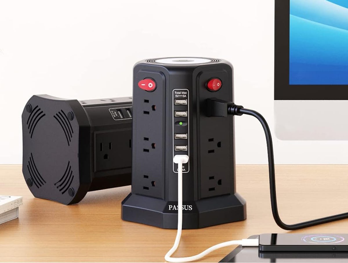 If you have a lot of devices, this space-saving surge protector will definitely come in handy. While it boasts 12 AC outlets and five USB ones, it has a small footprint thanks to its innovative tower design. It also has an adjustable night-light and even allows you to control the power on AC outlets separately.