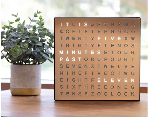 The Sharper Image LED word clock ditches the usual numbers and goes for something way cooler — words that light up, crossword puzzle style, to tell the time. Measuring 7.75 inches, it’s compact enough for a desk but makes a statement on a wall, too. It displays the time in 5-minute increments.
