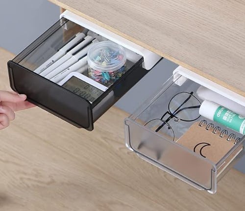 Add some storage space to your work area with this two-pack of under-desk storage drawers. Each drawer sticks right under a desk with strong adhesive, no tools or drilling required. Made from durable ABS plastic, the slide-out design makes it easy to access pens, cables, or whatever’s been cluttering up the surface.