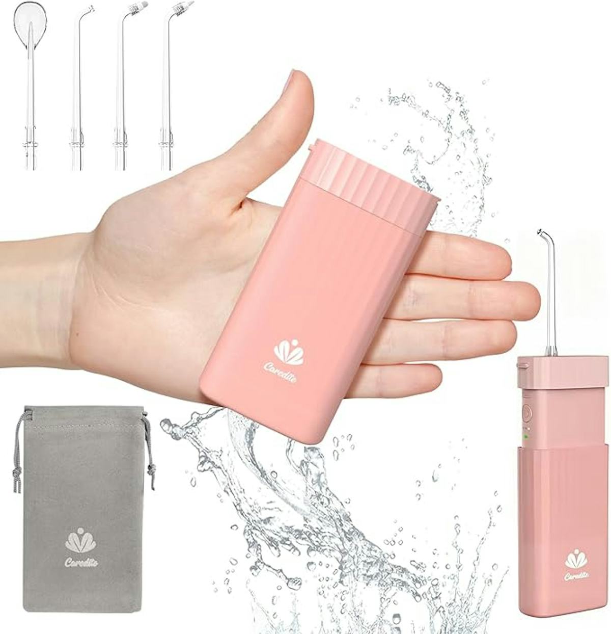 This water flosser is just 5 inches tall and comes with a bag for the four different included jet tips, making it a great add-on to your carry-on when traveling or work bag for long days. It has three modes that can suit everyone from the new flosser to those looking for a good, deep clean.