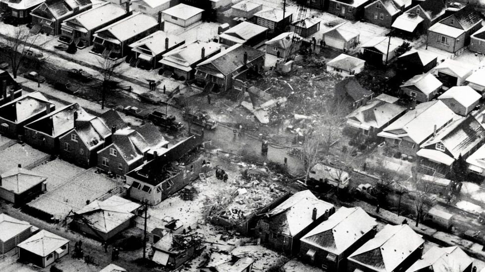 The boom the students felt was a commercial plane crashing into a row of homes a block away on West 70th Place. United Airlines Flight 553 had departed Washington, D.C., bound for Omaha, Nebraska, with a scheduled stop at Midway Airport. But just before 2:30 p.m., the 737 jet stalled and fell from the sky — killing 40 passengers, three crew members and a mother and daughter on the ground. The devastating crash leveled some houses, damaged others and almost immediately sparked conspiracy theories.