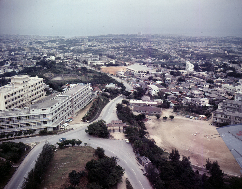 The large buildings to the left were the campus of the University of the Ryukyus, which was established by the United States on the site of the castle.
