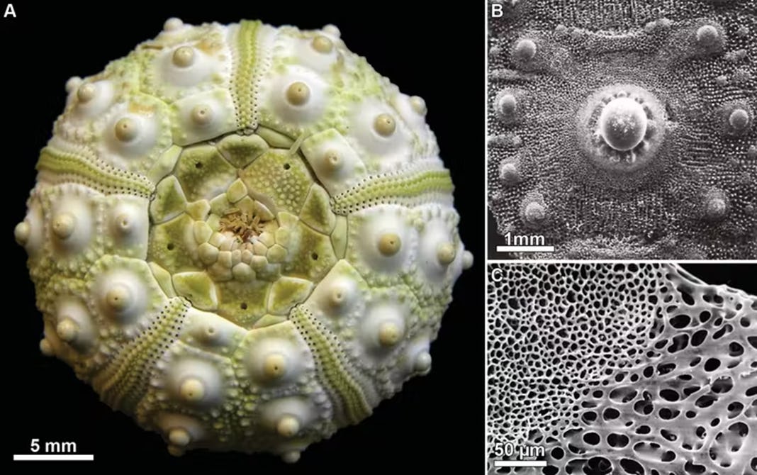 Most present-day echinoderms, which are found from the world’s coastlines to the ocean’s dark abyssal depths, have an internal skeleton. The exceptions are sea cucumbers and some species that live buried beneath the seabed. Their skeletons, like Yorkicystis, are formed by porous calcite plates.