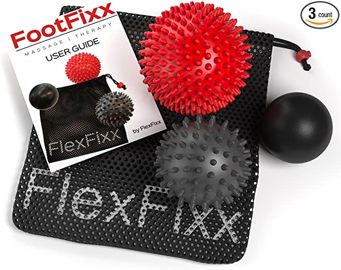 These three massage balls are designed to give three sensations of foot massage simply by rolling your feet on them. The small, solid black one really digs in while the larger two with spikes offer a gentler muscle massage. They help with plantar fasciitis at any stage and can also be used on other parts of the body. They come in a storage bag with instructions.
