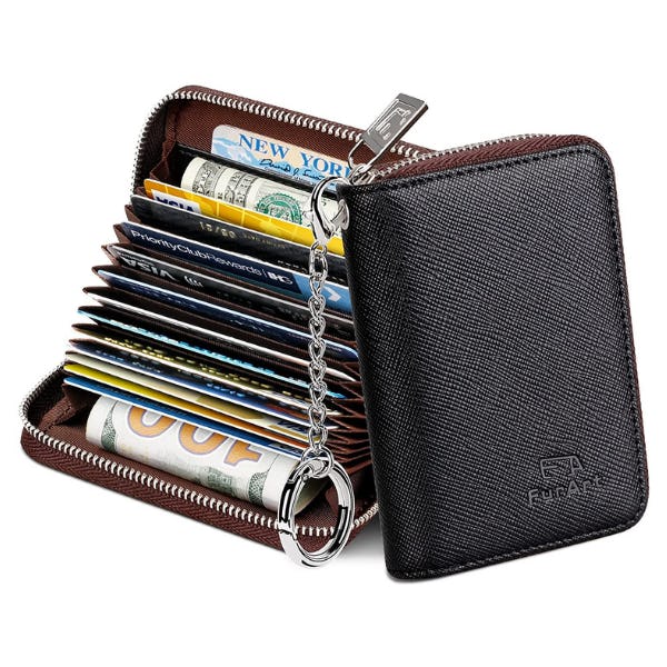 Leave bulky bags behind with this small zippered card case. Thirteen card slots provide space for ID and credit cards, and two additional slots offer room for your cash. The whole thing attaches to your belt loop or keys with a simple keyring. You can pick from over two dozen colors and patterns.