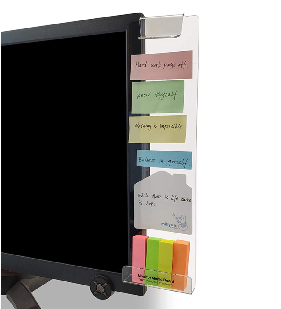 Keep important notes and reminders at eye-level so you don’t forget with this transparent monitor side panel. Strong adhesive holds it in place, providing a convenient spot for notes that isn’t directly on your monitor. Store a pad or two in the holder at the bottom or attach a notepad with the convenient clip.