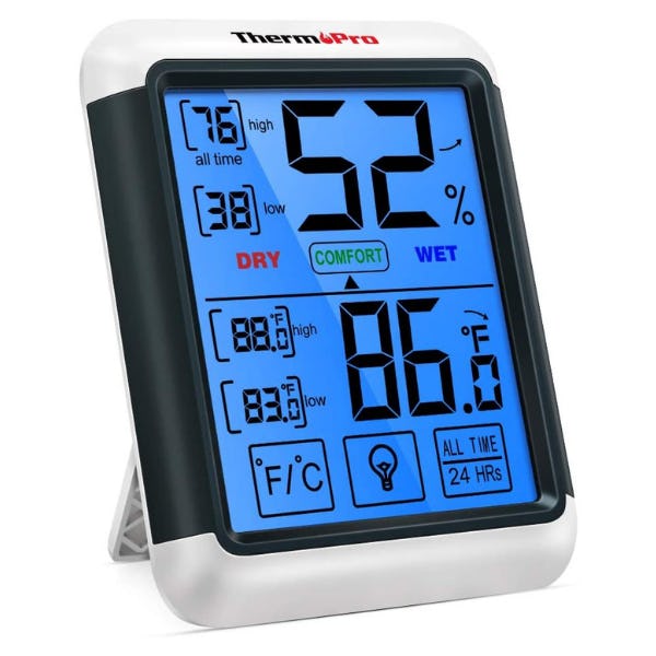 Track the temps inside your home with this indoor digital thermometer. The large backlit display is easy to read in any lighting, letting you see the exact temperature and humidity levels in your home. The 24-hour tracking with trending monitors changes so you can react by adjusting the thermostat. Mount it on a wall, table, or fridge for viewing.