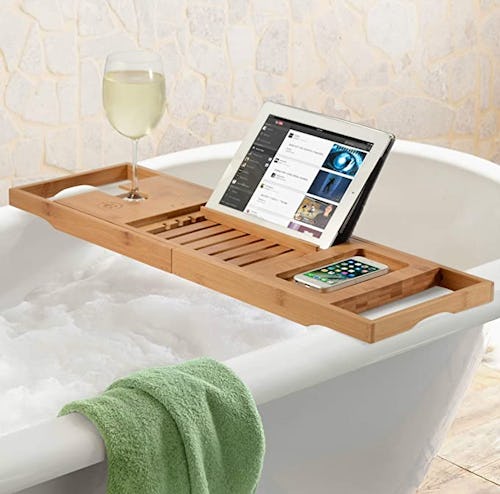 Stay in the bath as long as you like with this bathtub caddy made from eco-sustainable bamboo. It's outfitted with multiple compartments for storing your a book or tablet, phone, soap, and even a glass of wine. Designed to fit most tubs, it extends it extends from 28 to 41.5 inches, and the silicone grips keep it in place