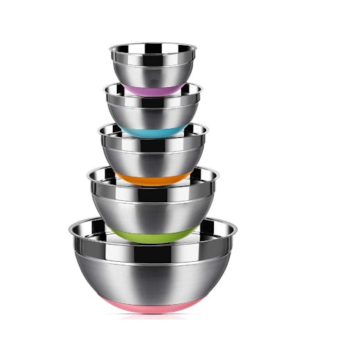 Trick out your kitchen with these stainless steel mixing bowls with color-coded, silicone bases that keep them from sliding around on your countertop while you're blending, whisking, and stirring. They’re also designed with wide, rolled rims for mess-free pouring, and the set includes five bowls in various sizes that can be stacked for storage.