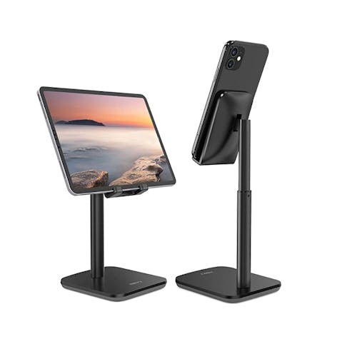 Go hands-free with this adjustable phone and tablet stand. It can be elevated from 6.3 inches to 9 inches, so you can get the right angle while preventing neck and back fatigue. The stand is designed with an aluminum alloy arm, a sturdy metal base, and a silicone pad that protects your phone from scratches.