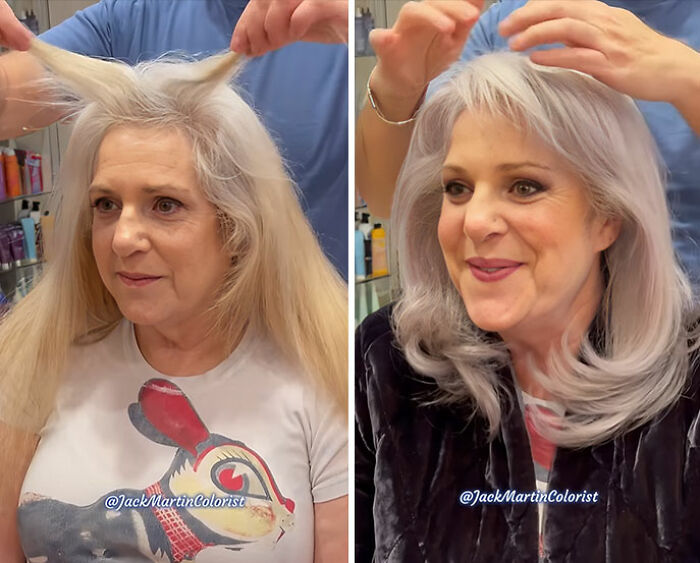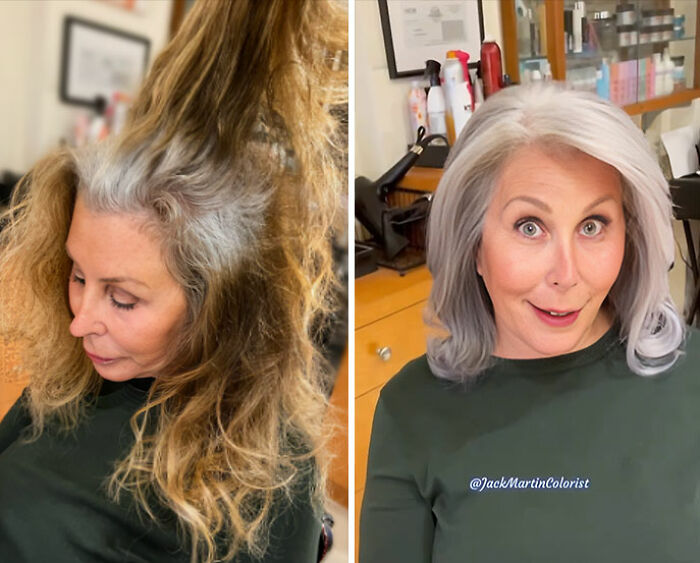 He accepted the “challenge.” But while many stylists may have opted for something like blonde, Martin had something else in mind. No more denying of natural beauty. Instead, he took the woman right back to her roots. Quite literally. And colored her hair a beautiful shade of silver to blend in with her gray tones.