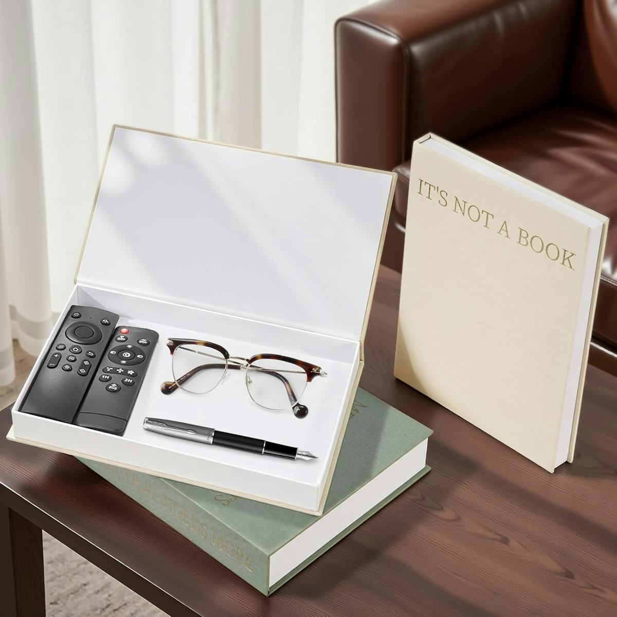 These linen-covered faux books look like chic decor (the gold lettering and the neutral tones give them a very designer home tour vibe), but they’re actually storage boxes in disguise. Each one opens up to hide the tiny things that constantly go missing — remotes, keys, chargers, jewelry, photos, whatever tends to float around your living room. They stack well and blend in with almost any aesthetic.
