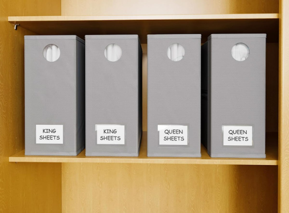These foldable sheet organizers can fit a full queen or king sheet set (plus a duvet cover and pillowcases) into a compact space. Plus, the circular windows let you see what's inside without digging through a leaning tower of folded chaos. They’re sturdy, sleek, and come with label cards so everything actually stays organized.