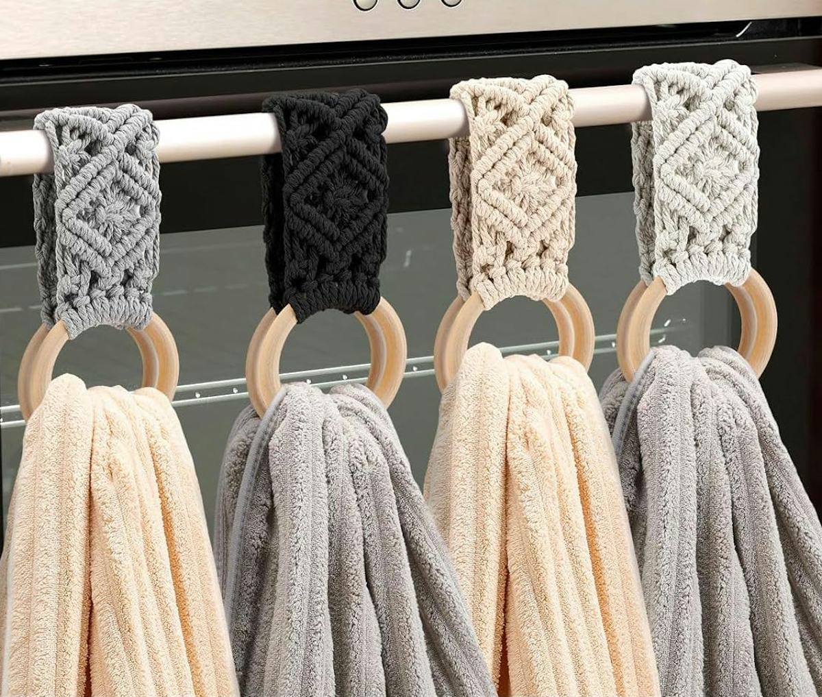 These crocheted towel holders are made with soft cotton yarn and complete with beechwood rings, so instead of half-fallen towels slipping off your oven handle, you get a secure little loop that actually keeps them in place. They fit on pretty much any handle (stove, dishwasher, cabinets, you name it) and the textured crochet creates an eclectic decor detail.