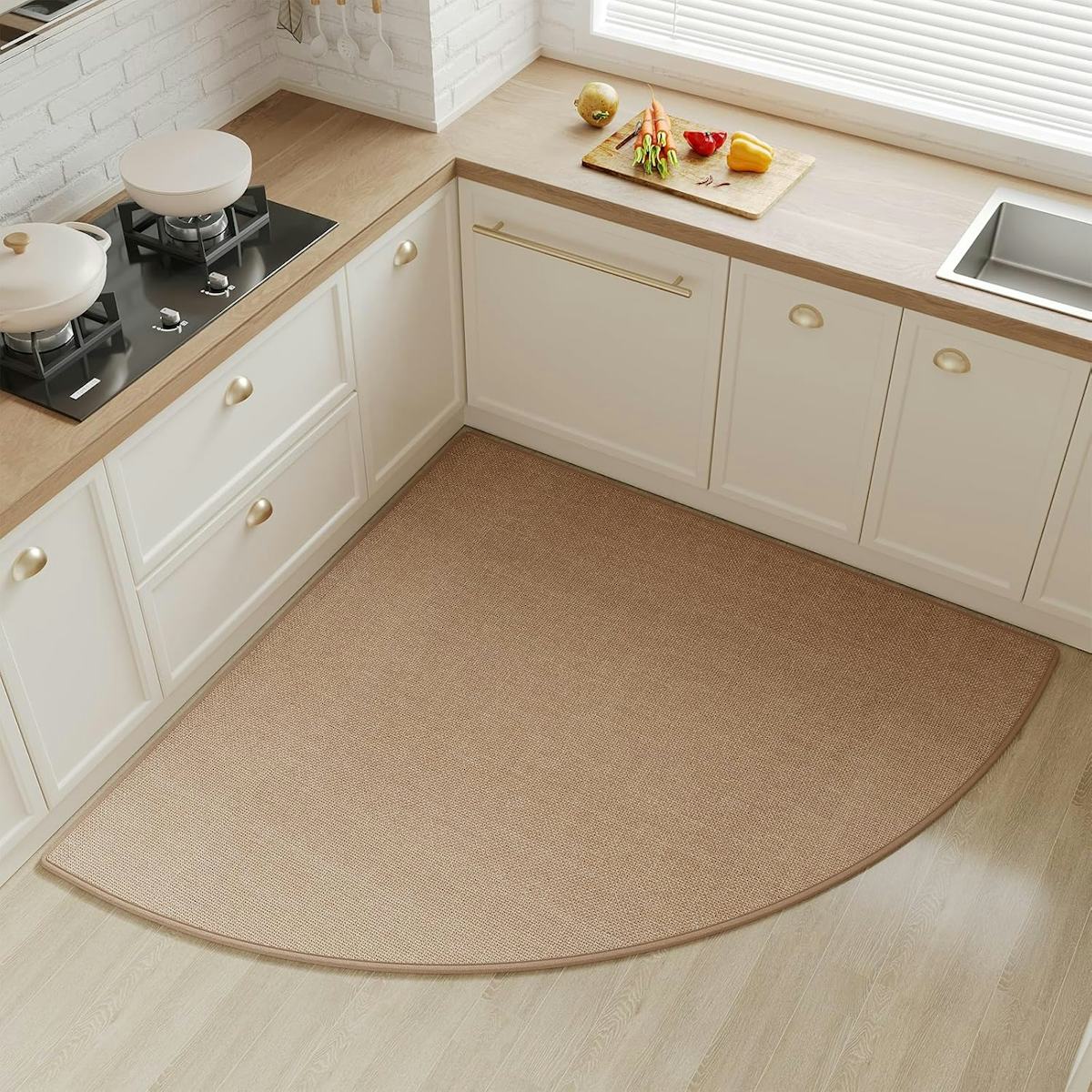 This curved corner kitchen rug looks a little unconventional, but that’s exactly why it works so well. It fits perfectly into those small sink corners where spills, splashes, and drips always land. The rubber backing keeps it flat and firmly in place, so slipping, sliding, and curled edges are a thing of the past.