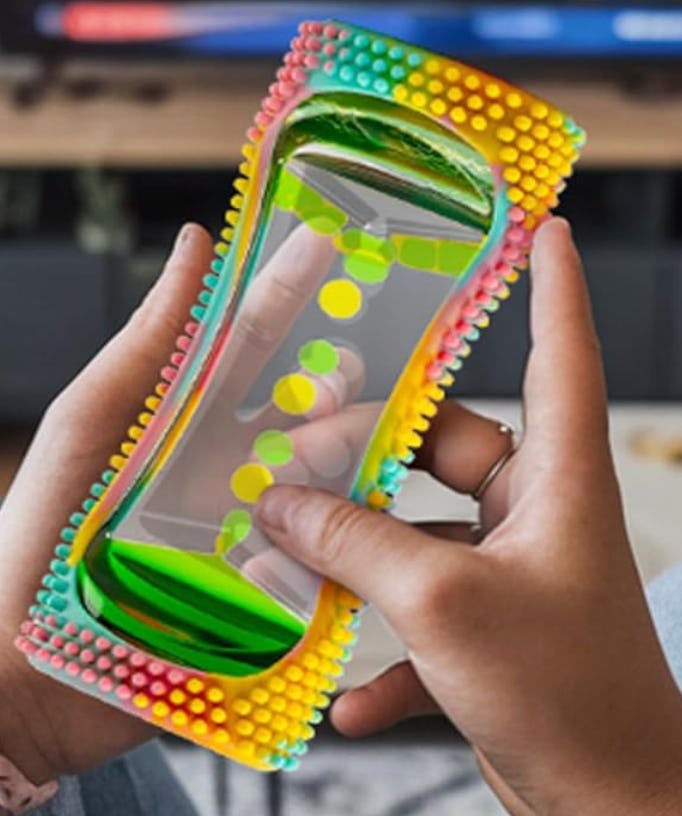 Amazon -This fidget toy is designed with a textured exterior that is soothing to hold, and has an interior filled with colored liquid bubbles that move when you shake it, rotate it, or flip it. The rainbow bubbles are fun to watch move around, and this makes for a good distraction from a busy mind.