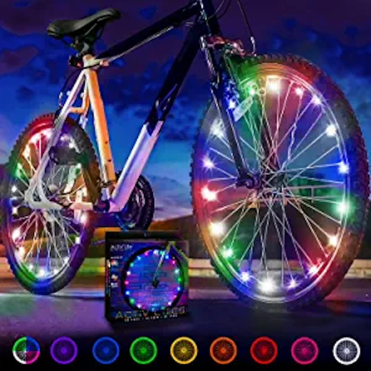 Customize your ride with these LED bike wheel lights that have a universal design that fits all standard wheel sizes. The set provides lights for two wheels and enhances both appearance and visibility. For maximum durability, the lights are waterproof and crafted from resilient silicone. They have a battery life of over 40 hours and include batteries for immediate use.