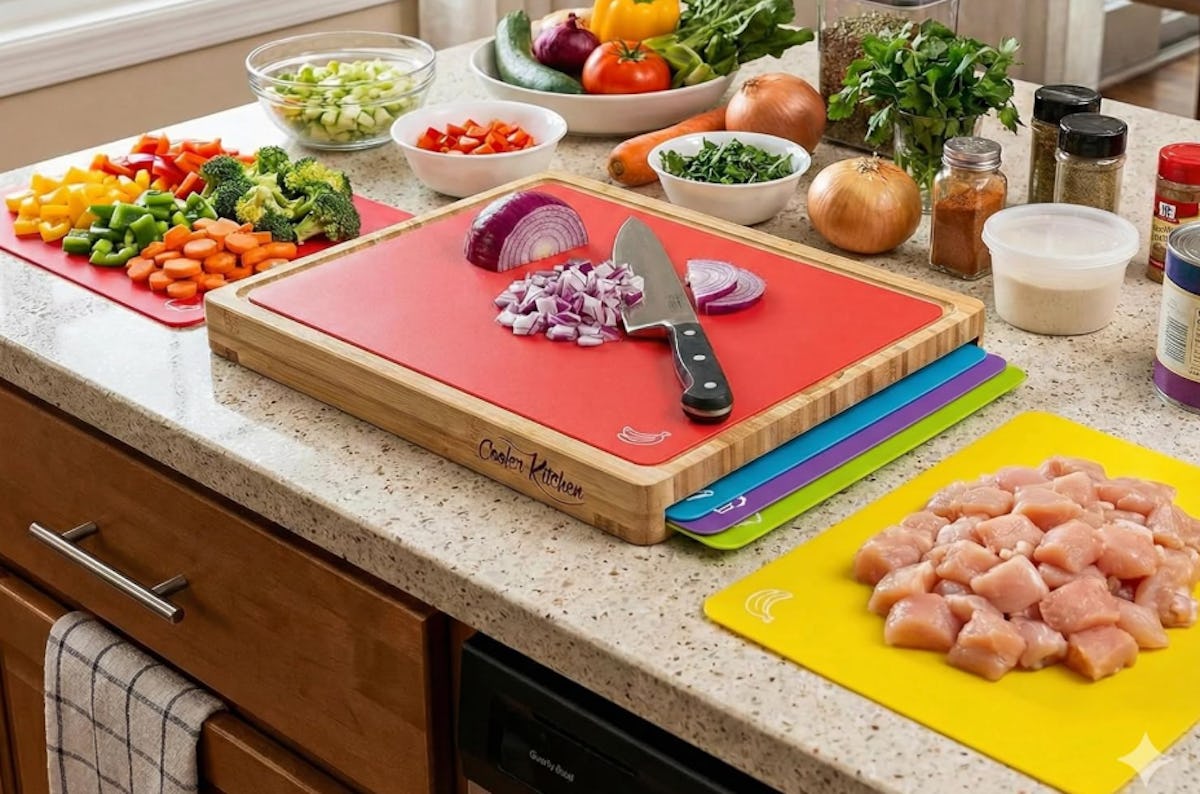 A space-saving bamboo cutting board with 6 swappable plastic mats