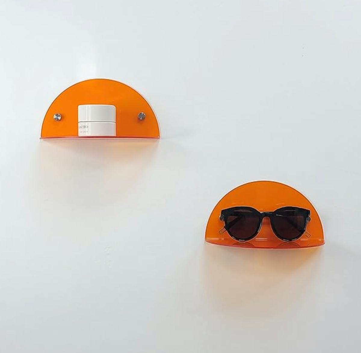 Inject a bright pop of color into your space with this pair of orange floating shelves. They are constructed from high-quality acrylic and feature a minimalist semi-circle design. The 8-inch shelves can be wiped down with a damp cloth for a quick clean, and they include all necessary mounting hardware for simple installation.