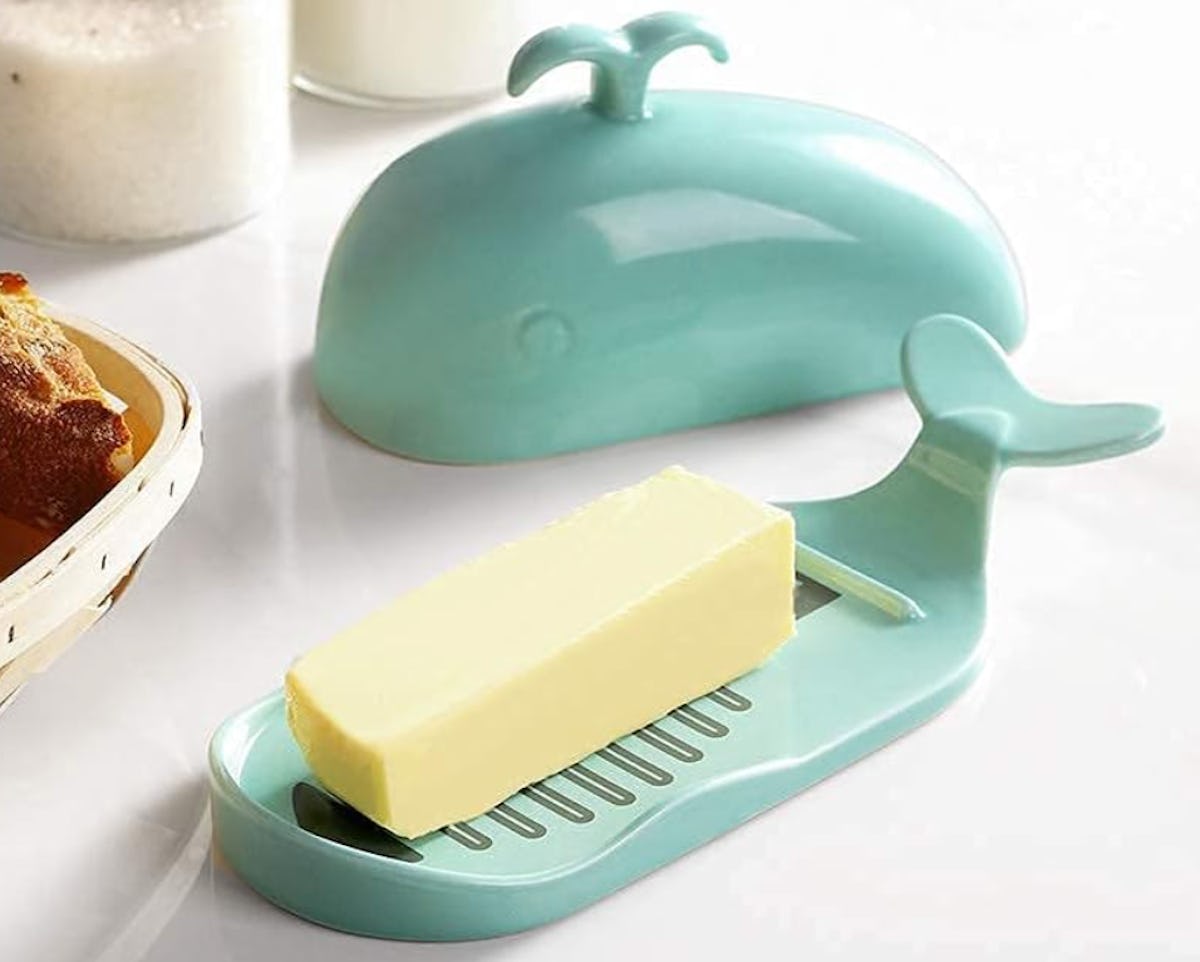 Store a stick of butter in this fun and functional ceramic whale butter dish. The turquoise dish has a nonslip base with two sets of cutting measurements and a raised line that prevents the butter from sliding. The lid has a cute fishtail handle that provides a good grip for picking the lid up and covering the dish again. The whale dish is highly durable and microwave, dishwasher, and freezer-safe.